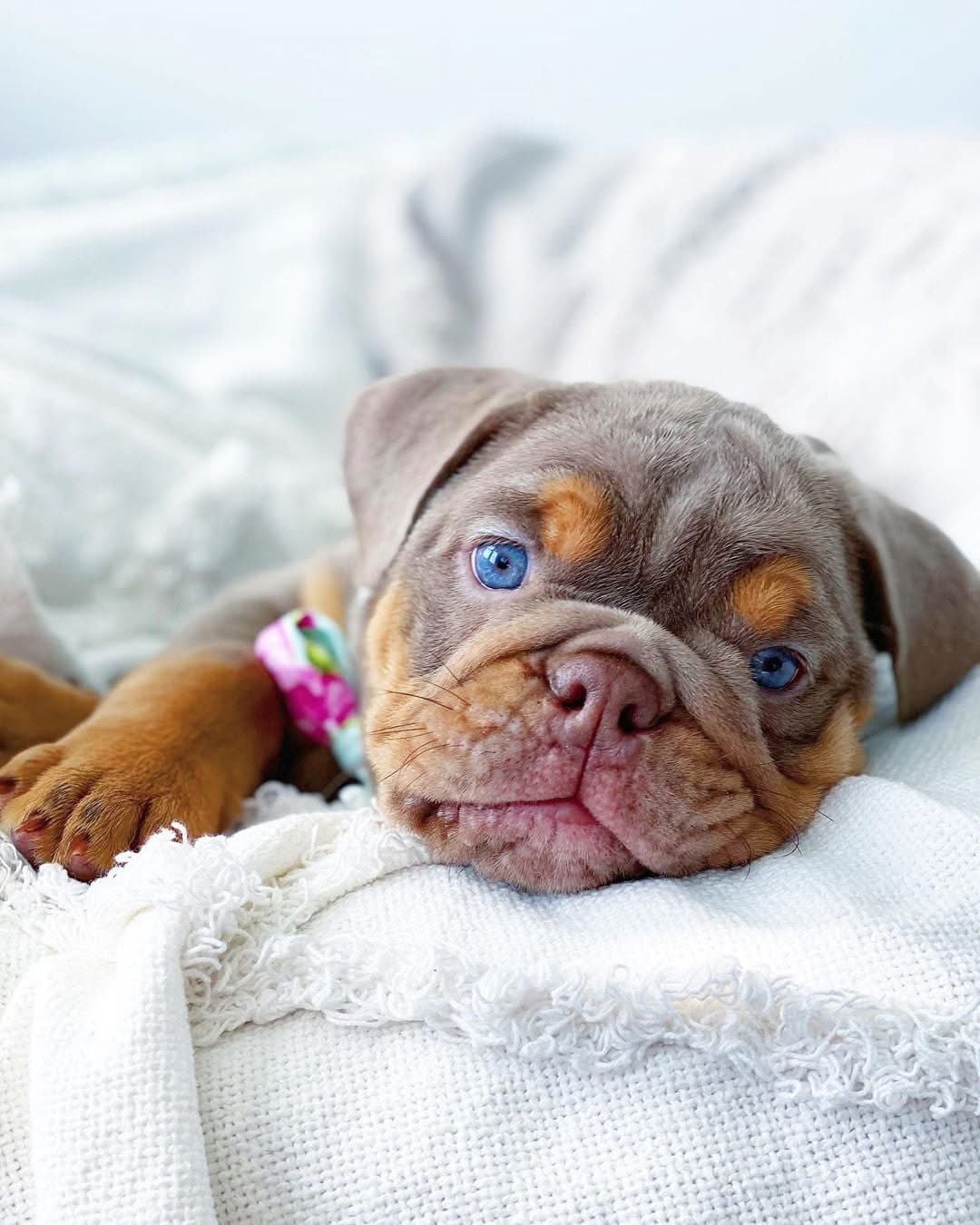 Say hello to Daisy, a breathtaking lilac tan English Bulldog puppy with a rare and luxurious coat that makes her truly one of a kind. Her soft, plush fur shines in a delicate lilac (dilute chocolate) hue, accented by rich tan points on her face, chest, and legs. With her deep wrinkles, strong rope over her nose, and bright blue eyes that sparkle with personality, Daisy is the perfect blend of elegance and Bulldog charm.